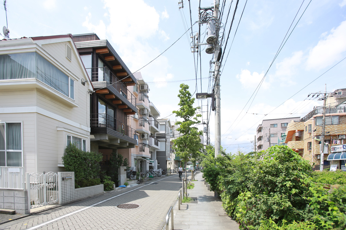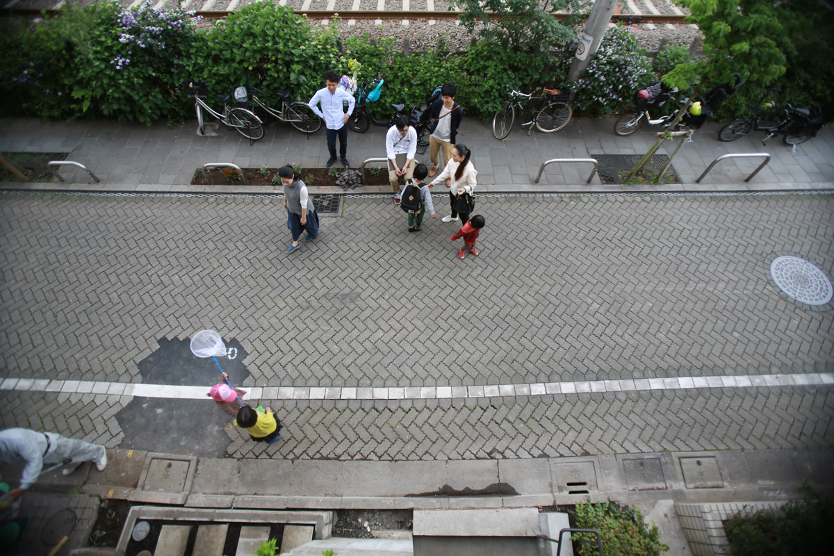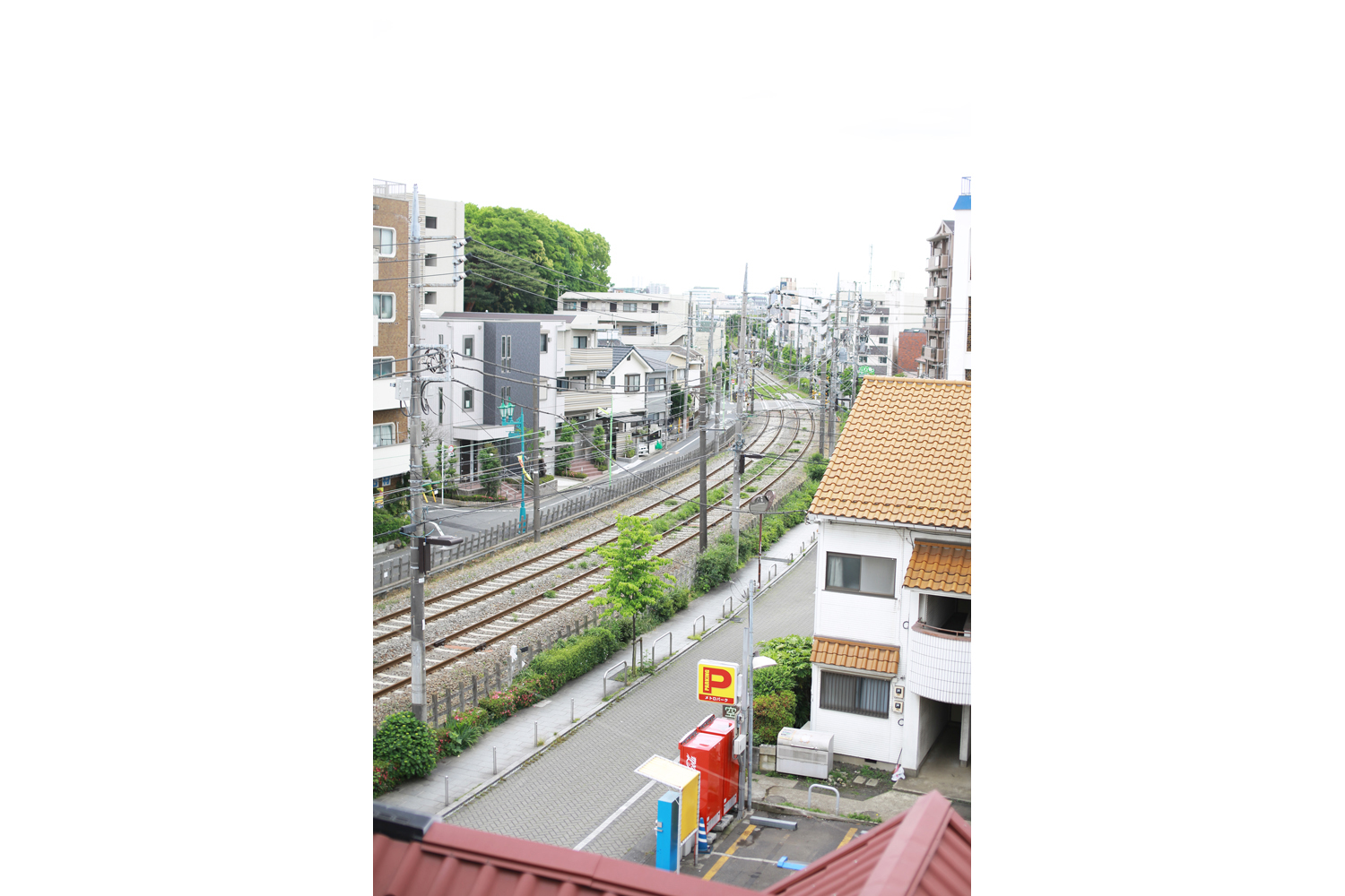 2階のテラスより、道路を見下ろす。向こうには路面電車が通っています。