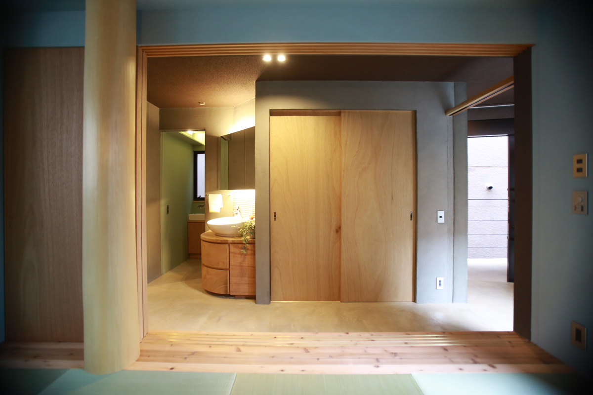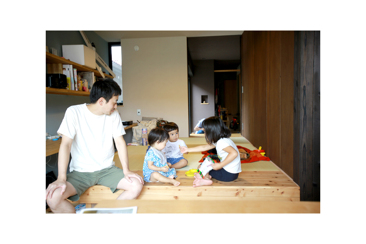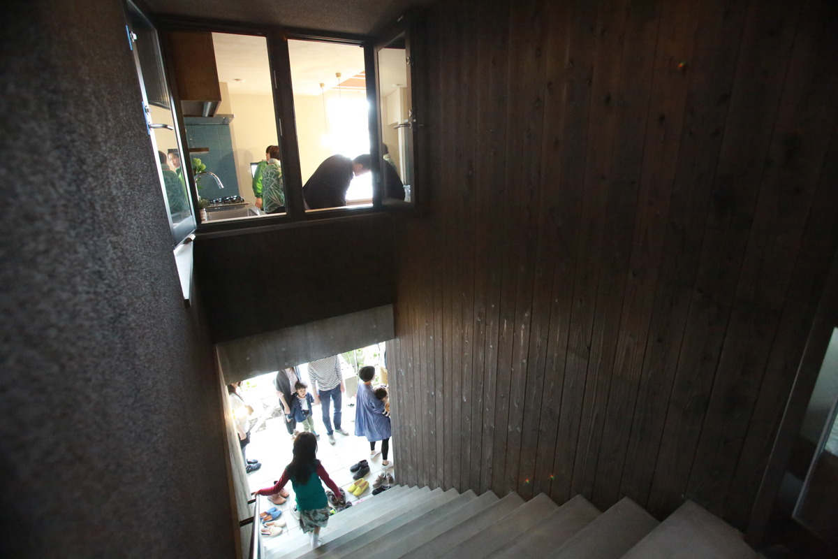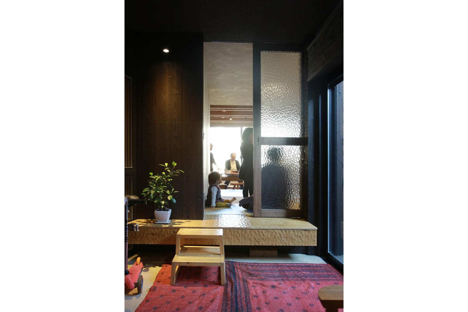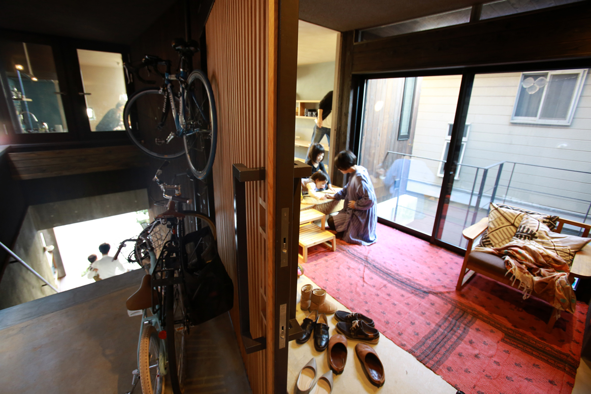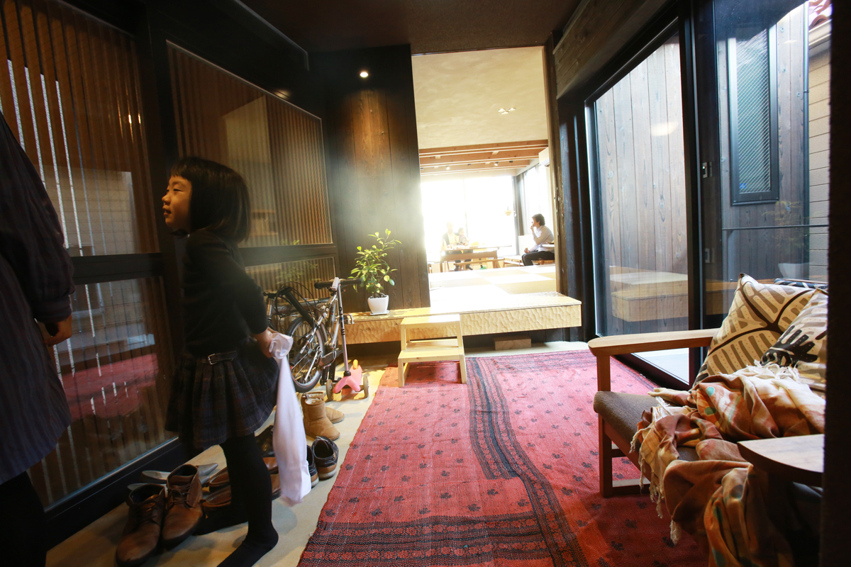 2階の玄関。広めの土間も、居場所になっています。奥は畳の居間。(2階)