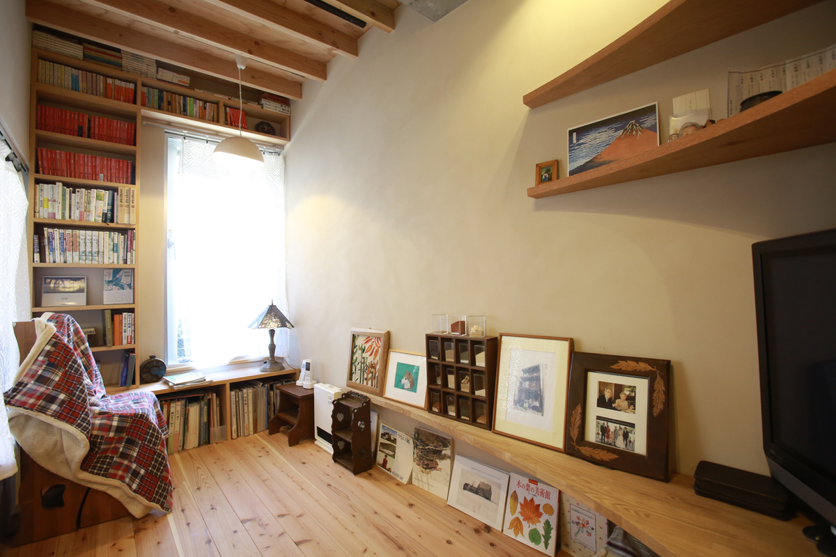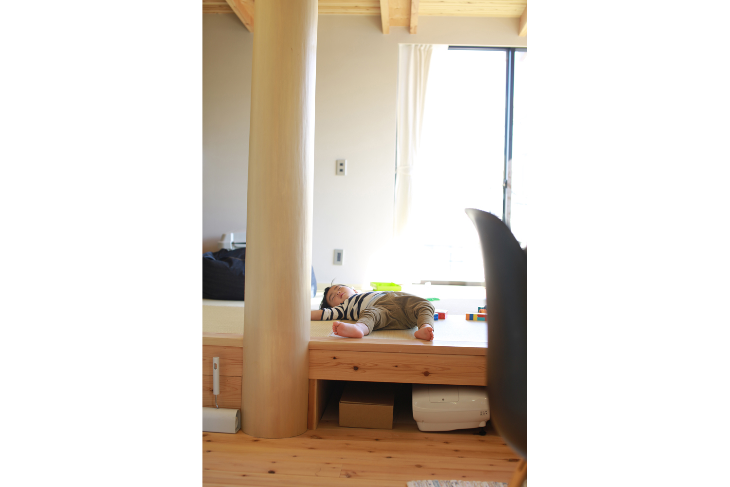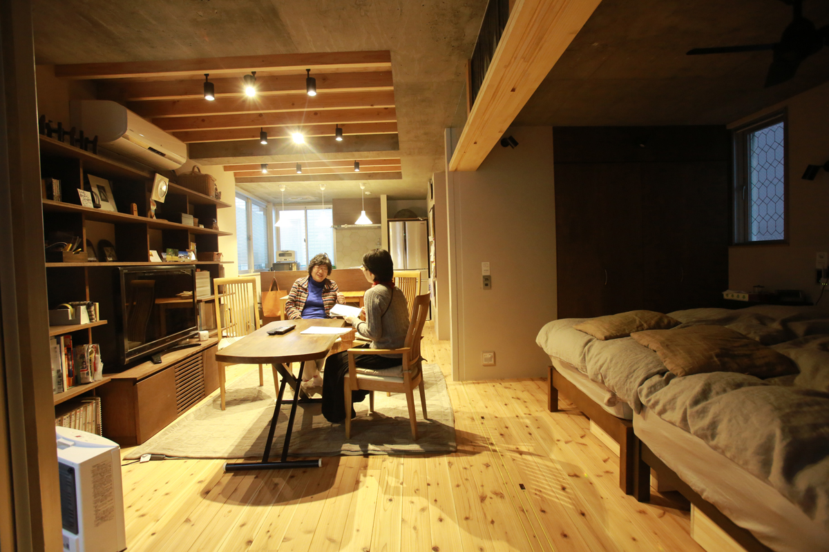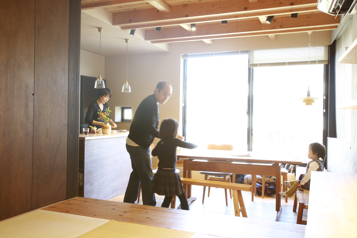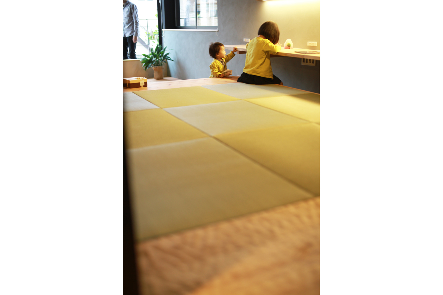 2階の玄関。広めの土間も、居場所になっています。奥は畳の居間。(2階)