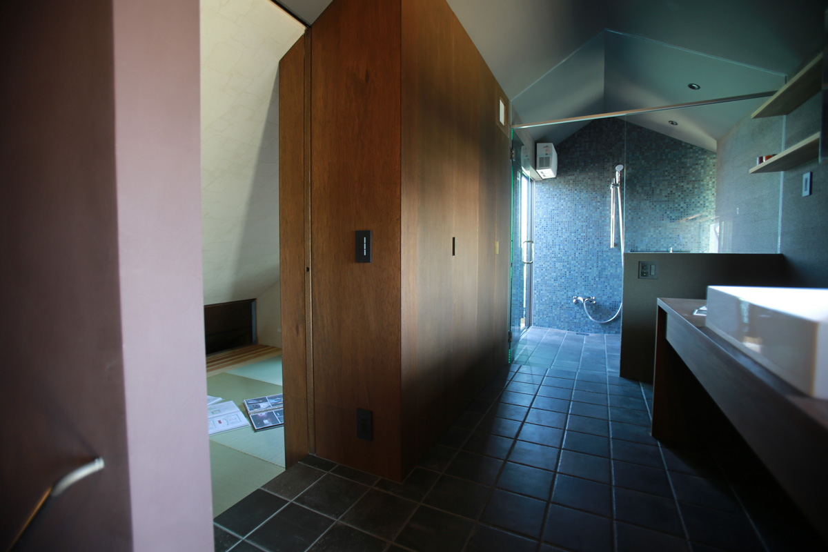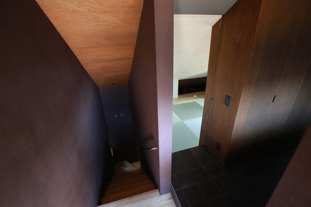 壁の仕上げは、この塀の仕上げ材を家中のベースと設定し、各階に展開している。