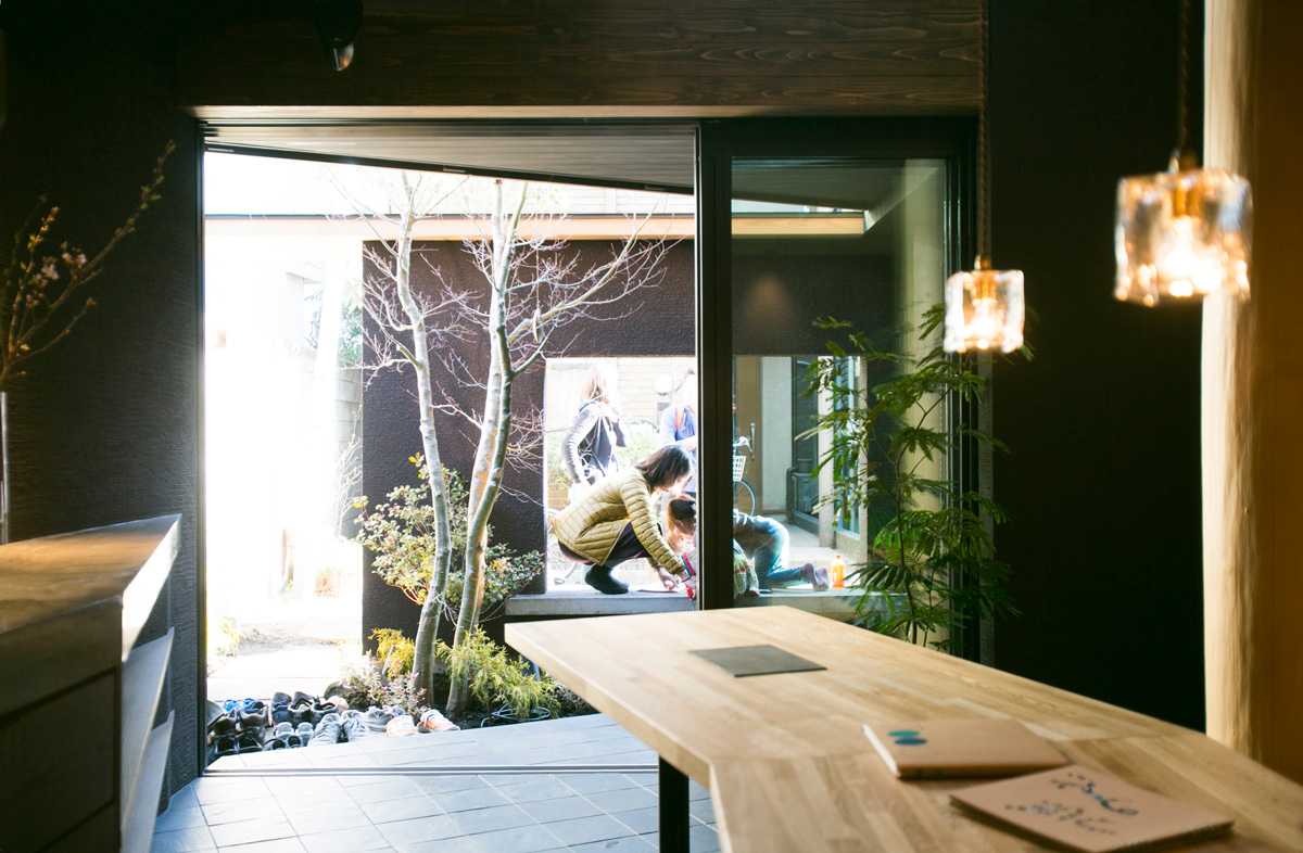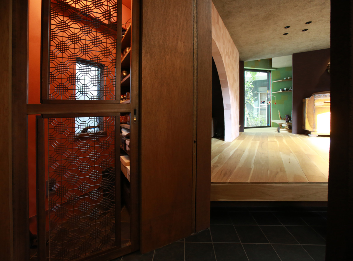 左の古建て具の朱色のスペースは、玄関収納。突き当たりの裏庭まで視線が抜けます。