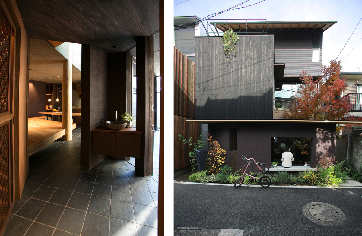小さな生活と街の間に、同一素材で包まれた「吹き抜け」「庭」「塀」の3種類の要素が挟み込まれる事で、