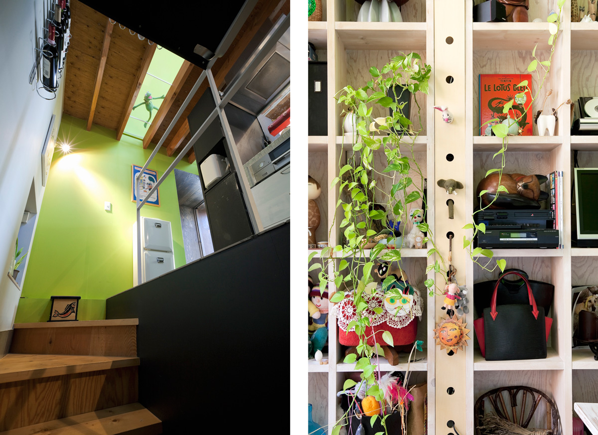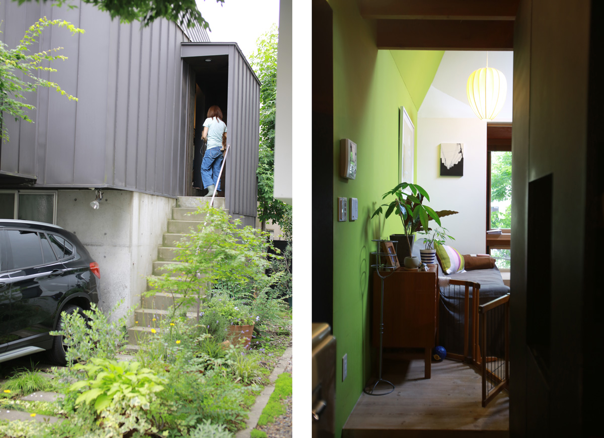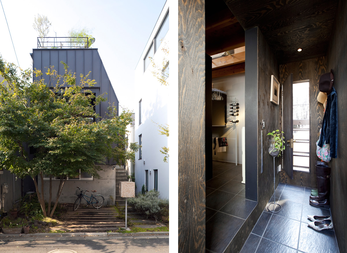 右:玄関。小さな家なので、玄関も最小限。でも、奥の扉から、屋上へ登ることができたり、圧迫感はありません。