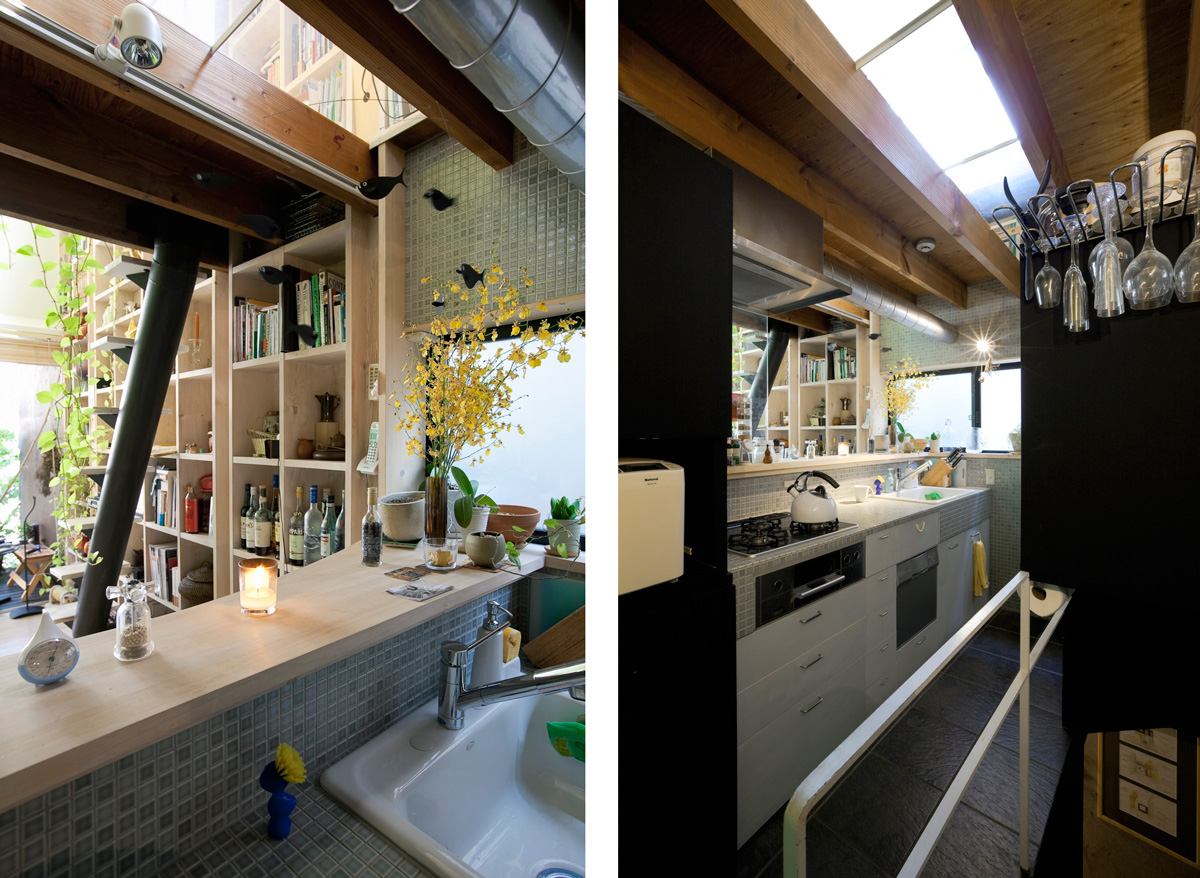 左:キッチンより見る。上の床は、ところどころ透明になっていて、猫のお腹が見えますね。