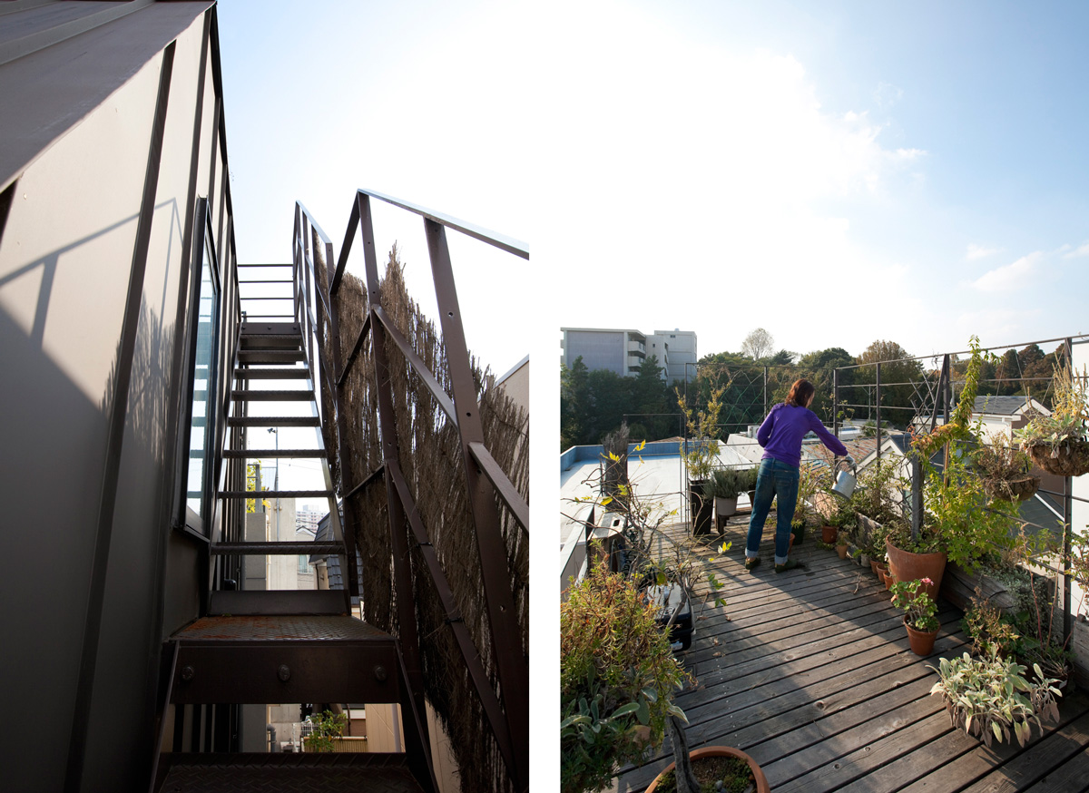 屋上に登る階段と、屋上。たくさんの植物が育っています。