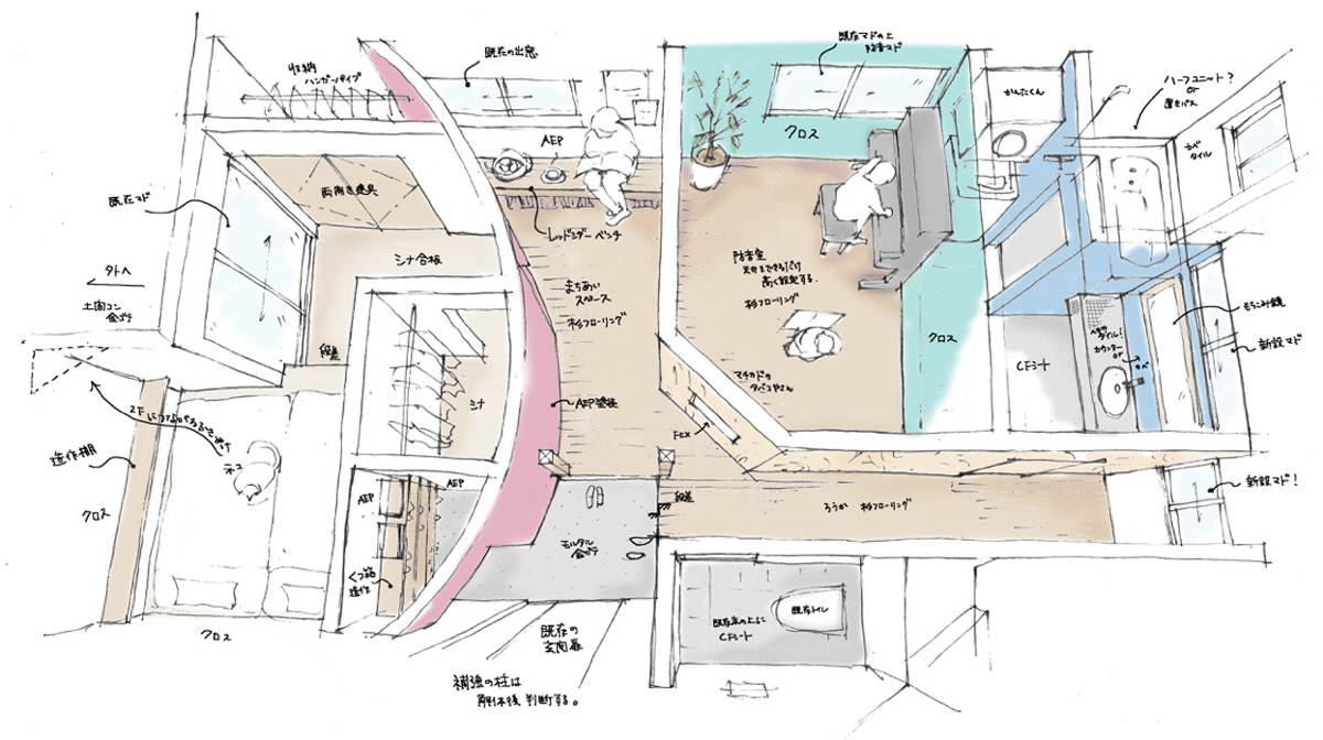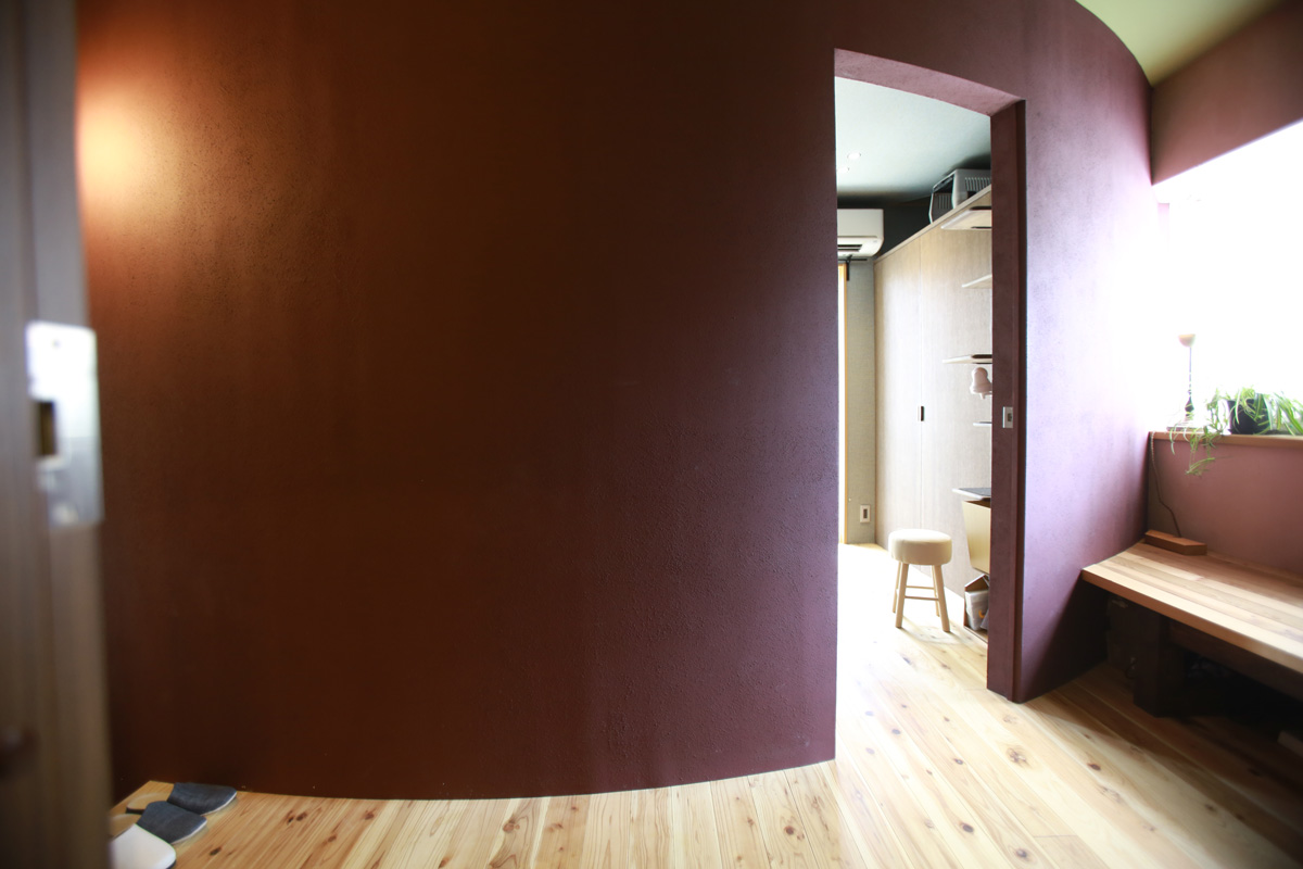曲面の中には、キッチンやトイレ、子供室が入っています。