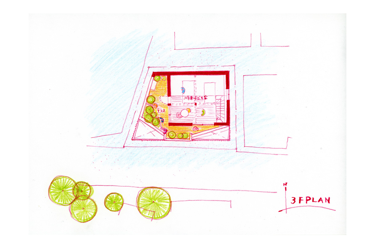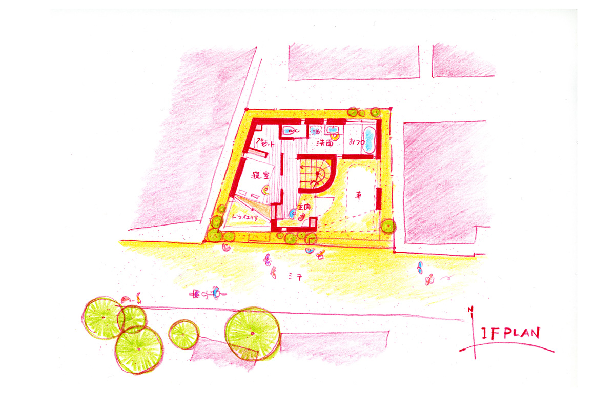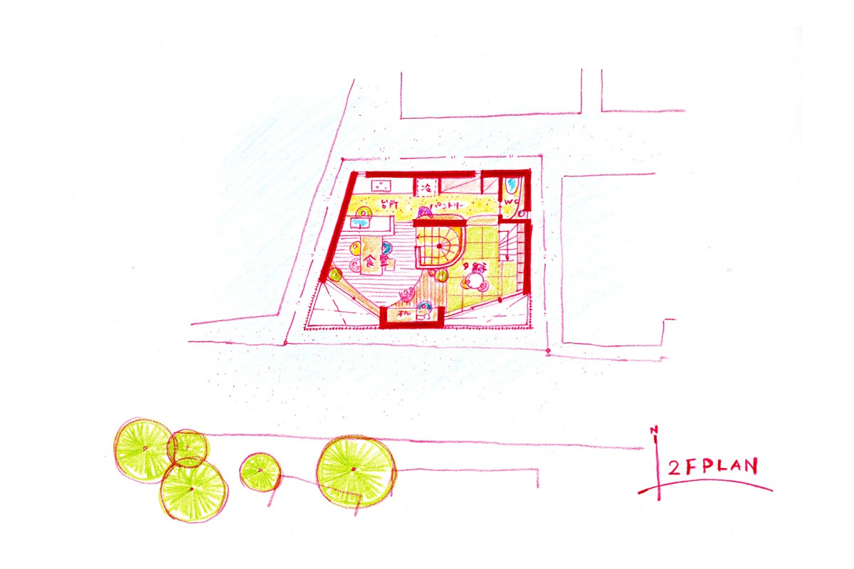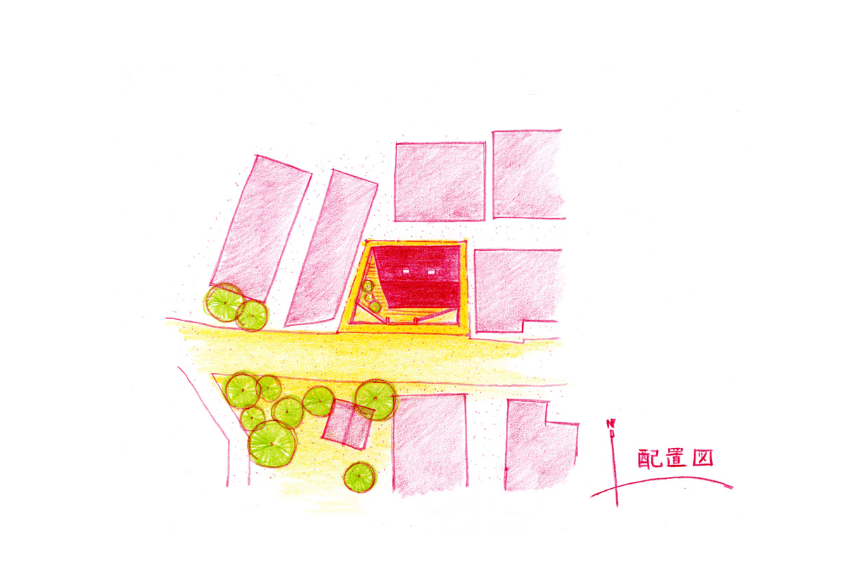 敷地は20坪程度しかないため、制限いっぱいのボリュームを計画しつつも、