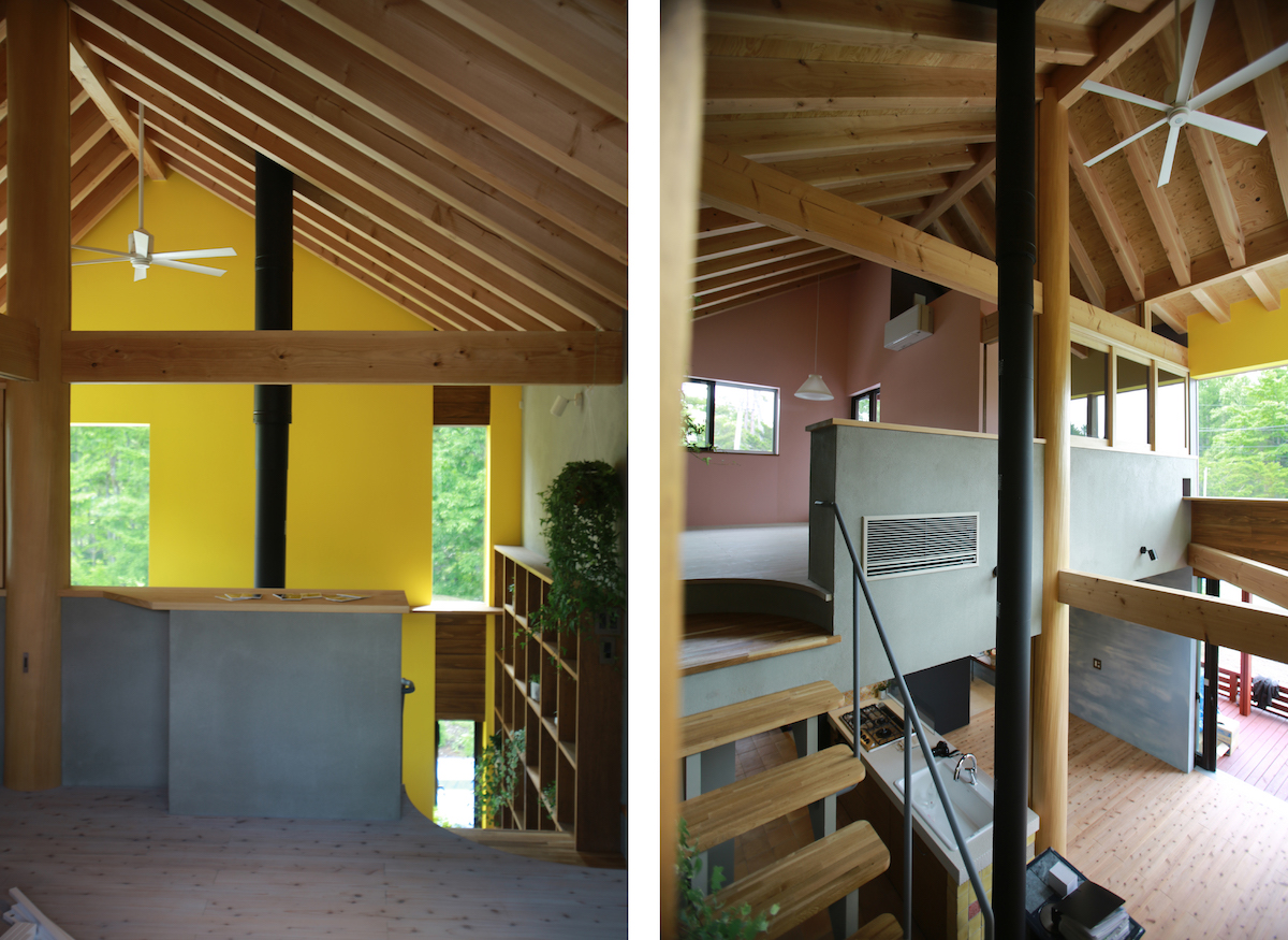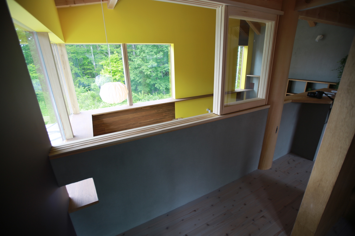 二階の寝室から、吹き抜けと森をみたところ。吹き抜け側に、ぐるりと回した広めの窓枠は、キャットウォークです。