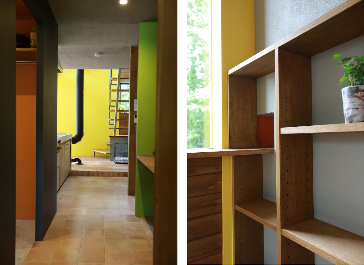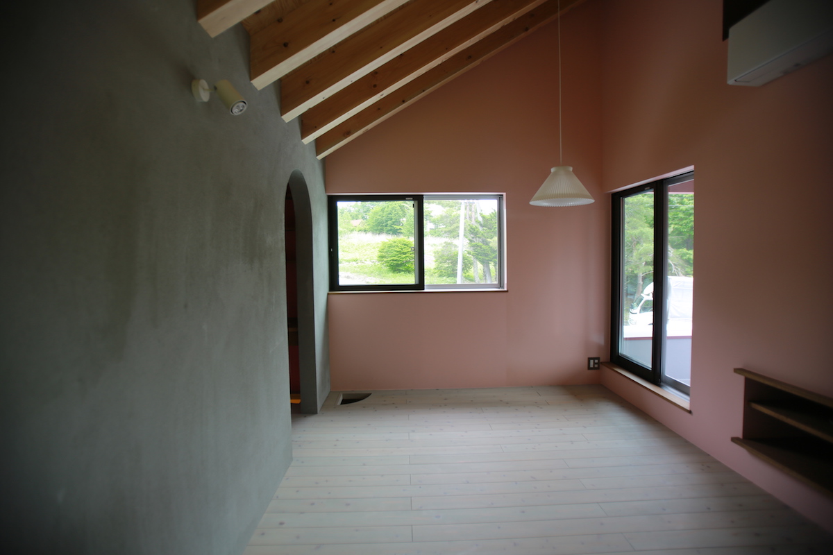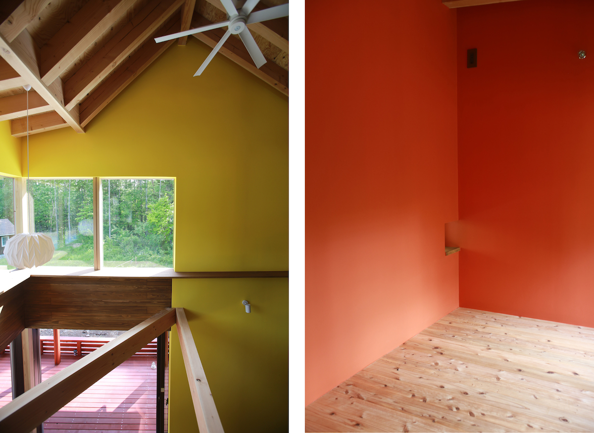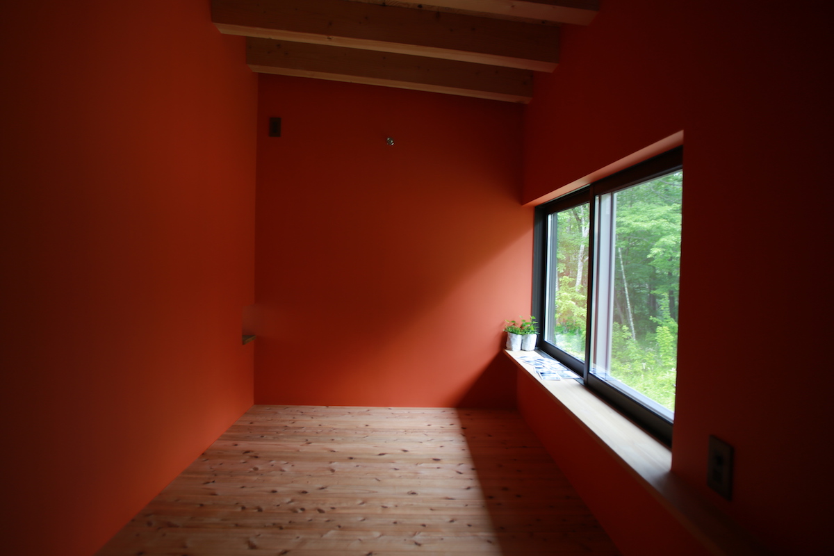 朱色のゲストルーム。左手の小さな穴は、猫が吹き抜けに猫が移動するための猫穴です。