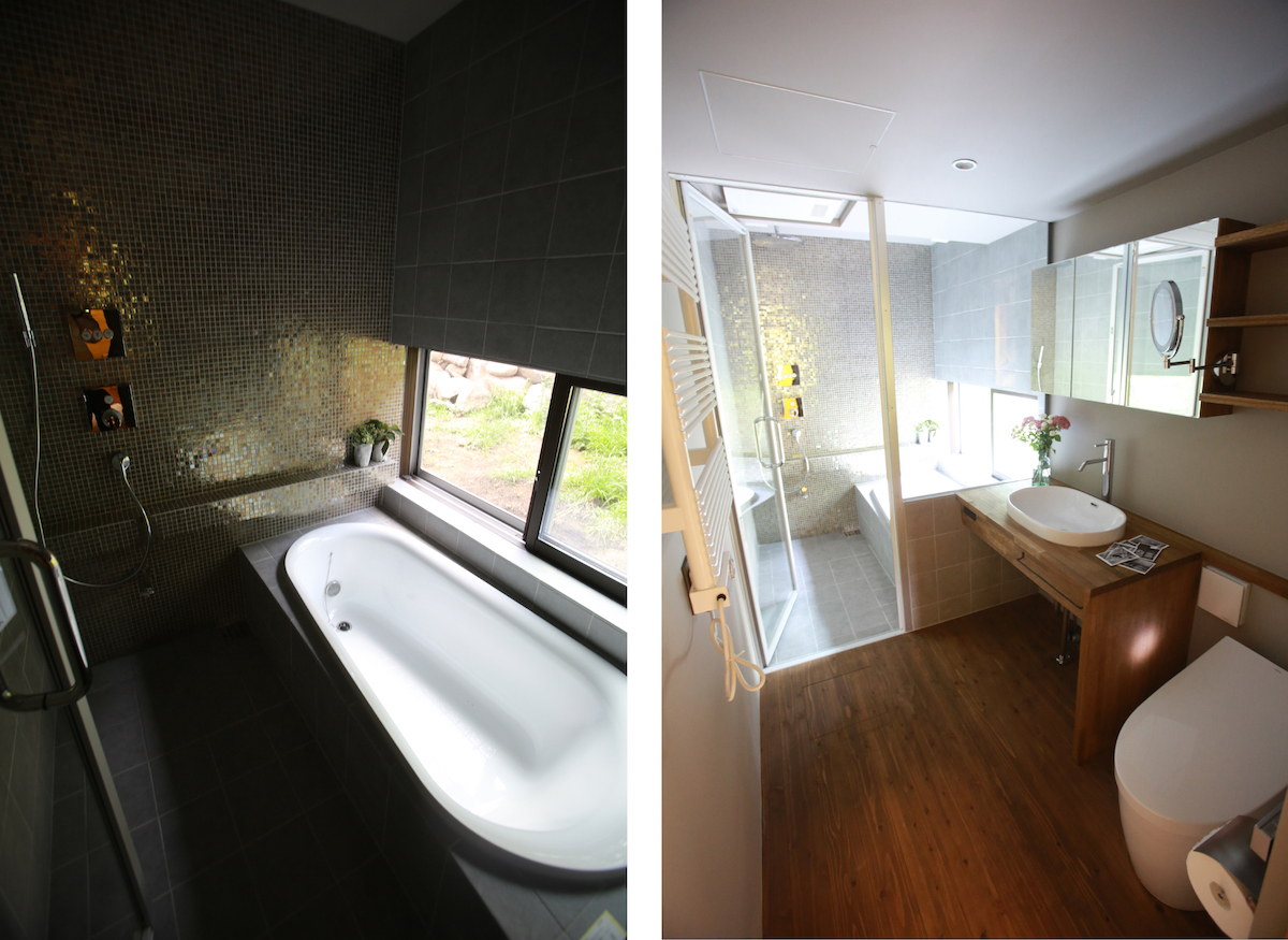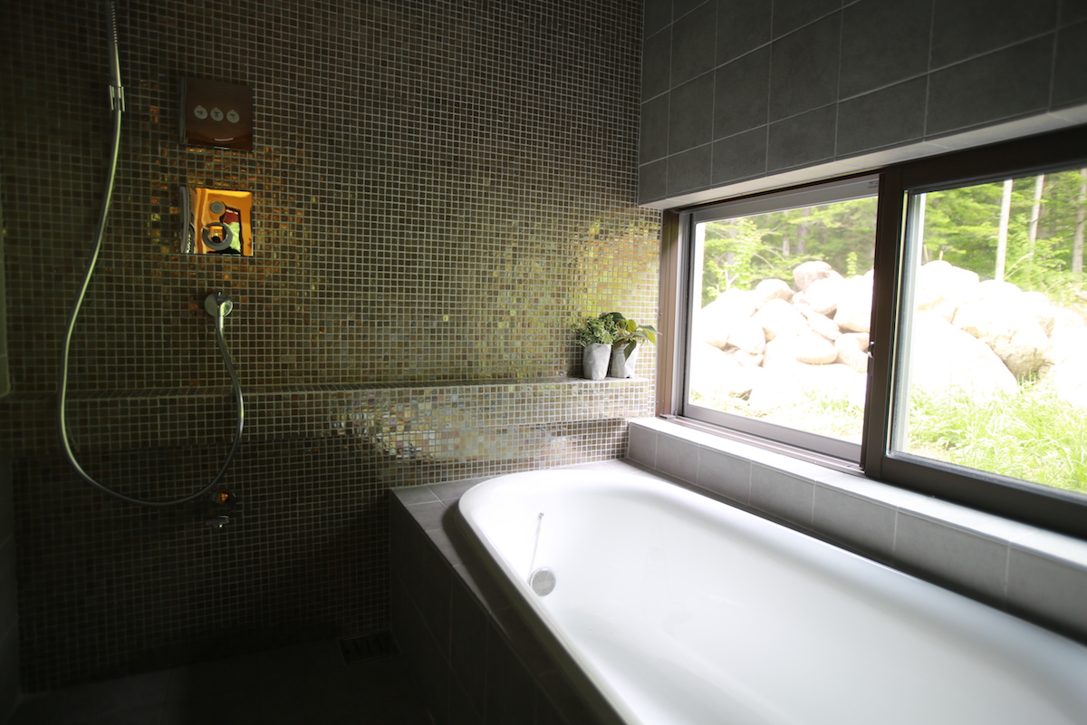 入り込む光が、キラキラと乱反射するタイルを使用したバスルーム。