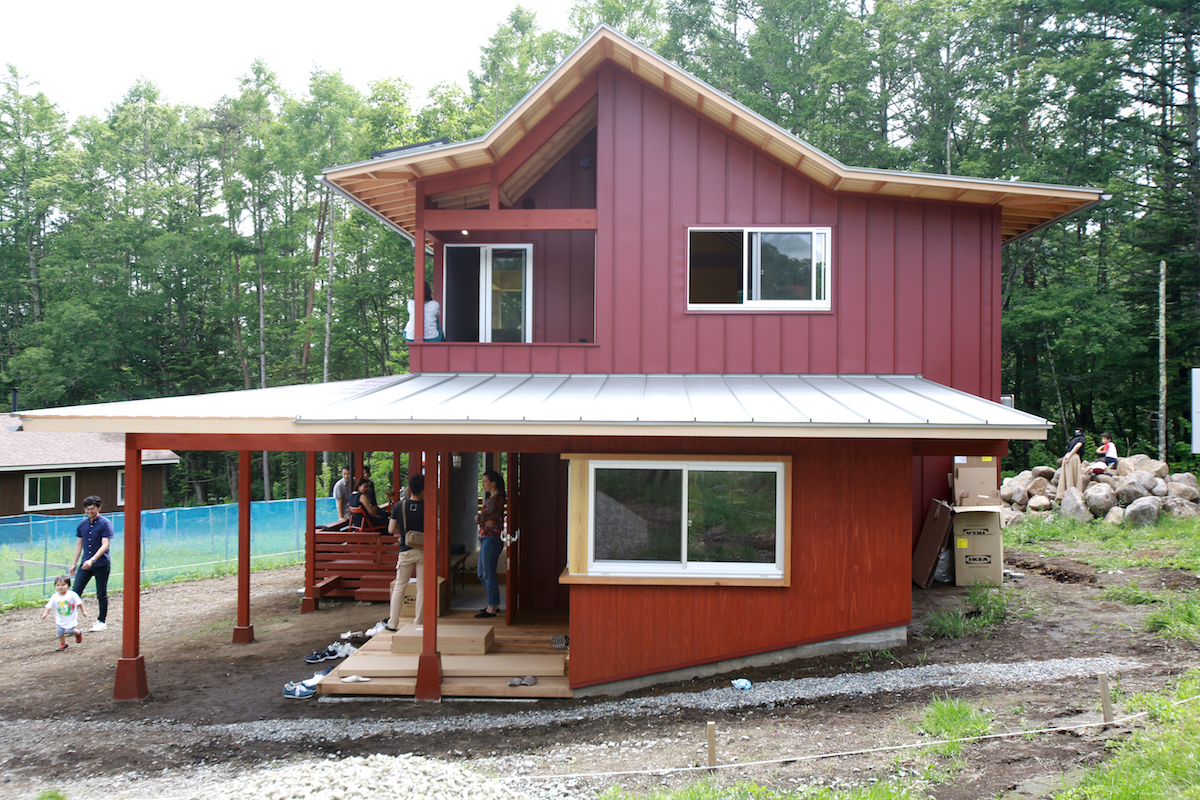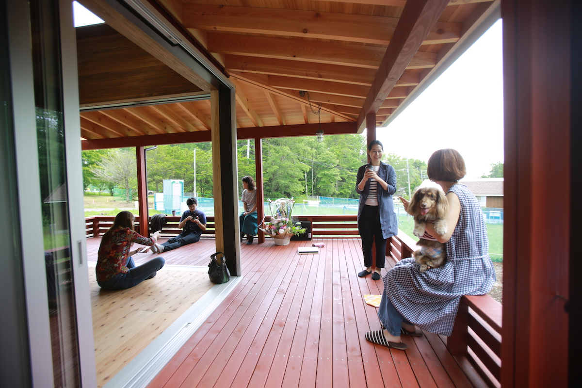 屋根のあるインナーテラス。赤く塗られた木部が周囲の自然を引き立たせます。