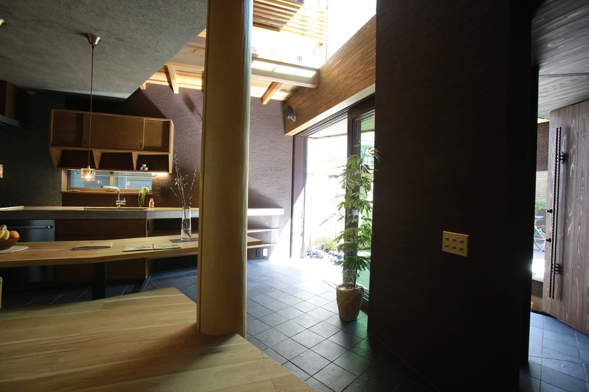 左の古建て具の朱色のスペースは、玄関収納。突き当たりの裏庭まで視線が抜けます。