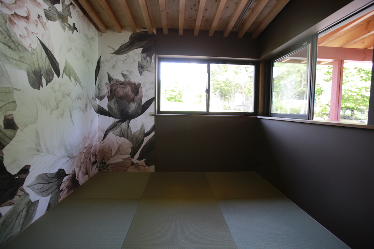屋根のあるインナーテラス。赤く塗られた木部が周囲の自然を引き立たせます。